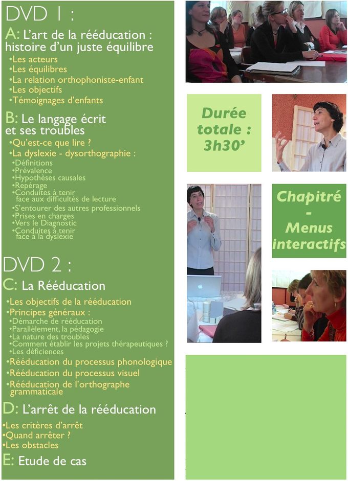Et bien-sûr, mes DVDs possèdent des menus et sont intégralement chapitrés de manière à vous permettre de revenir plus tard exactement au passage que vous souhaitiez revoir, instantanément. Une phrase mal comprise ? on rembobine ! Vous voulez prendre des notes pour la séance de lundi matin avec le petit Bertrand ? Appuyez sur pause !